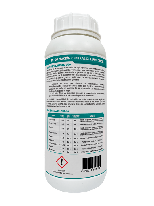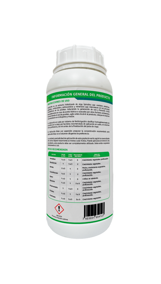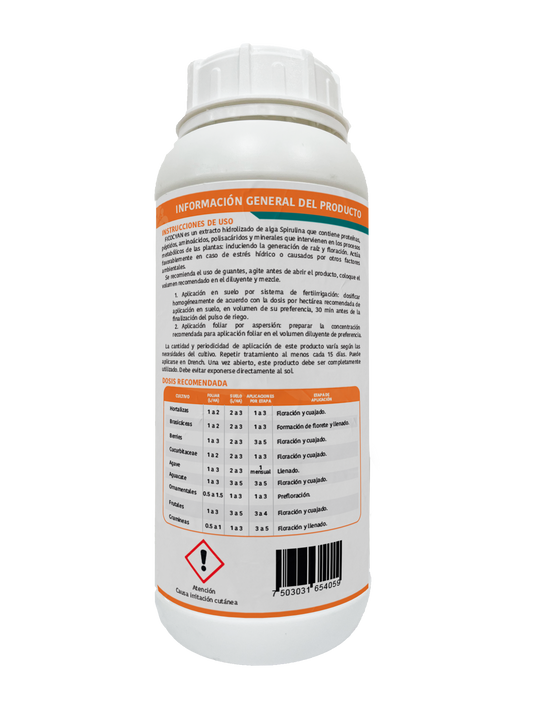 - Utilizamos Spirulina (Arthrospira maxima) de la más alta calidad como base de nuestros bioestimulantes. Su contenido excepcional de nutrientes asegura un impacto positivo en la salud y vigor de los cultivos, promoviendo un crecimiento sostenible y respetuoso con el medio ambiente.